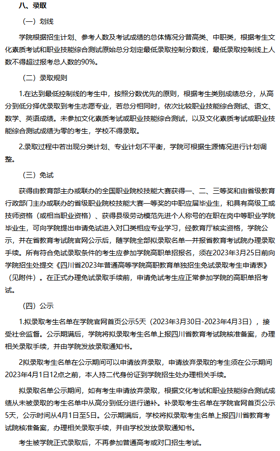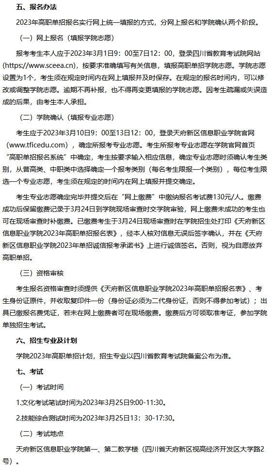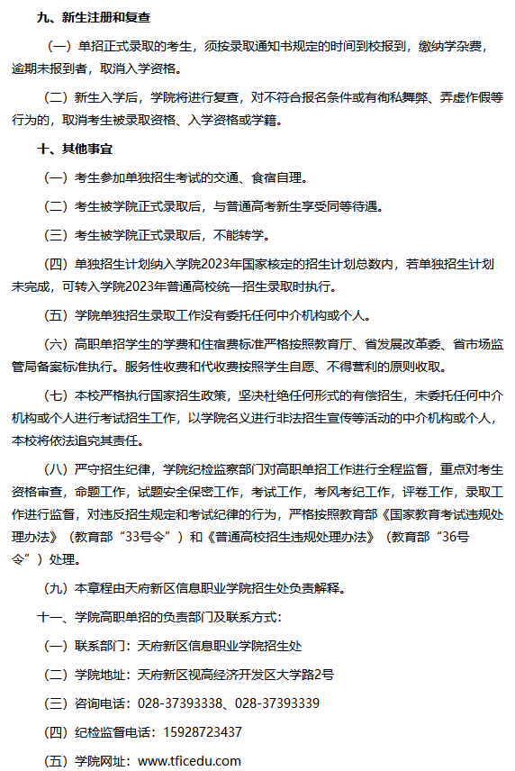 天府新区信息职业学院2023年高职教育单独招生章程